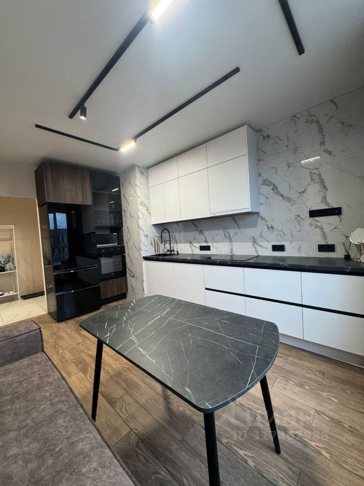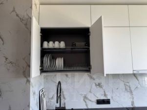 На кухне очень функциональный и продуманный гарнитур, где вы сможете с полным комфортом не только готовить, но и проводить время за большим удобным диваном и мягким пуфиком.