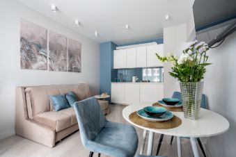 • в спальне кровать размера king-size с белоснежным бельем (премиум класс), а в гостиной раскладной диван, который превращается в полноценное спальное место;