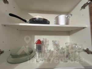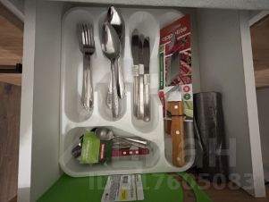 Функциональная кухня — плита, холодильник, микроволновка, чайник, полный набор посуды и обеденная зона.