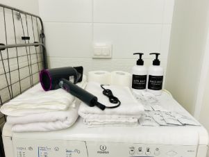 Ванная комната с махровыми полотенцами, одноразовыми средствами гигиены и феном.