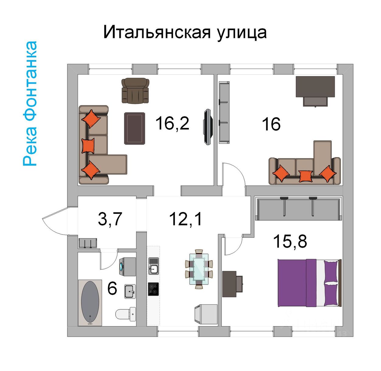 Окна кабинета и гостиной выходят на Итальянскую улицу. Окна кухни и спальни выходят в тихий двор. Площадь комнат 16+15,8+16,2 м2. Площадь кухни 12,1 м2. Высота потолков - 3,6 метра. Дом после капитального реионта. Перекрытия железобетонные.