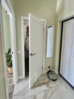 Пол в коридоре и ванной выполнен из итальянского керамогранита, в комнате и гостиной зоне лежит водостойкий ламинат с имитацией рельефа дерева, двери - натуральный шпон, все элементы освещения в квартире - производство Италия.