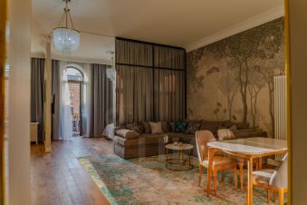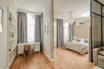 Добро пожаловать в апартаменты "Ривьера" с сауной на Невском проспекте! Насладитесь уникальным видом с балкона на главную улицу города и почувствуйте атмосферу петербургской жизни.