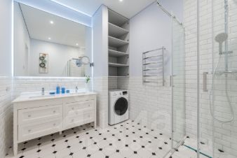 -Современная ванная комната с душевой кабиной, стиральной машиной, мягкими полотенцами, тапочками и халатами.