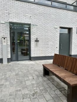На территории просторного двора для жителей есть зоны отдыха со скамейками, две детские площадки и тренажёры для взрослых.