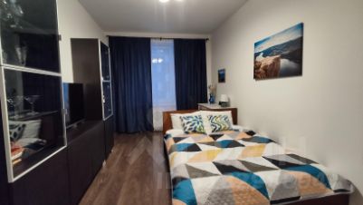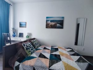 В квартире сделан евроремонт, обстановка современная. Есть все необходимое для комфортной жизни: большая кровать с ортопедическим матрасом в комнате и диван на кухне, рабочий стол и вместительный платяной шкаф в комнате, кухонный стол и журнальный столик у дивана на кухне, есть телевизор, холодильник и стиральная машина, микроволновка. Санузел раздельный, оборудован ванной и современной сантехникой. Из кухни можно выйти в теплое время года на просторную лоджию для уютных посиделок. Для Вашего удобства подключен wi-fi. Квартира граничит с одними соседями, в ней всегда тихо и уютно.