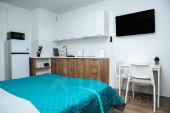 Полностью оборудованная студия: посудомоечная машина, стиральная машина, постельное белье, банные полотенца, шторы blackout, приветственный набор: чай, кофе, сахар, таблетки для посудомоечной машины, капсулы для стирки. очень удобная кровать с матрасом Askona.