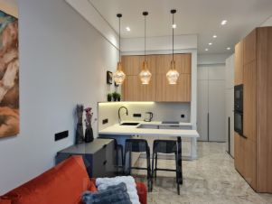 * Большой 2-спальный диван.Продуманная эргономичная кухонная зона с достаточным количеством мест хранения оснащена встроенными посудомоем, варочной индукционной панелью, вытяжкой (заведена в венткороб), СВЧ, духовкой, 2-камерным тихим холодильником.