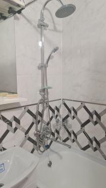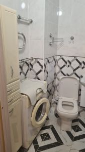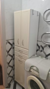 Санузел совмещенный, с ванной, установлена стиральная машина.