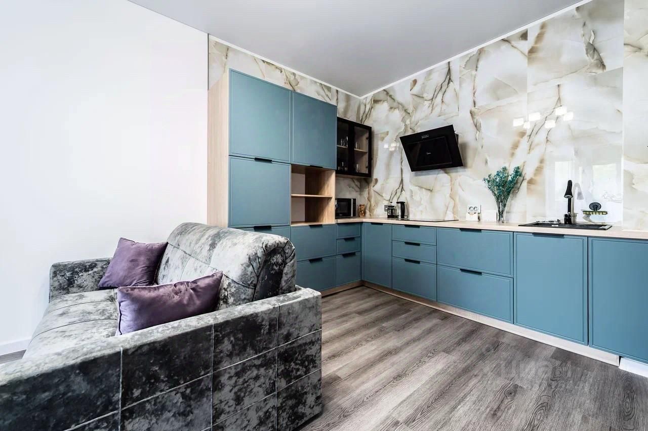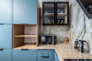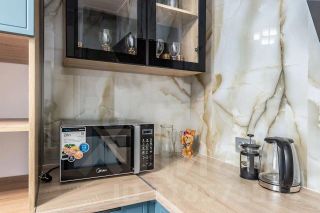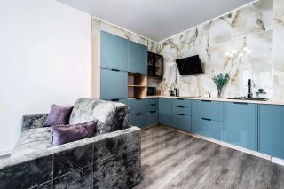- Кухонный гарнитур с варочной поверхностью, холодильником, микроволновкой, чайником, духовым шкафом, набором посуды для готовки и сервировки