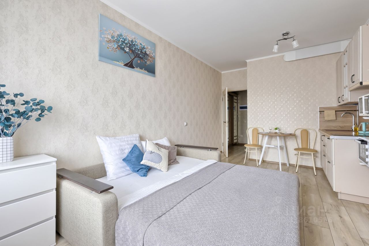 Транспорт. м. Ленинский проспект и Проспект Ветеранов — ~14 мин транспортом; аэропорт Пулково — ~30 мин на авто; Петергоф — ~30 мин, Константиновский дворец — ~15 мин. Панорама залива открывается с общего балкона; из студии — вид на тихий двор.