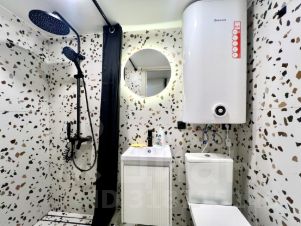 Чистый, в кафеле. Душевая кабина, туалет, раковина, зеркало, фен.