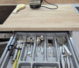 -кухонный гарнитур, духовой шкаф, варочная панель, микроволновая печь, система очистки питьевой воды, холодильник, вся необходимая посуда;