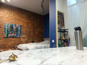 Большая двуспальная кровать с ортопедическим матрасом и подушками, постельное бельё. 2 окна, есть роллеты - полный блэкаут, присутсвует выделенное помещение\гардеробная площадью 4,5 кв. м. Также две софы, для чтения\отдыха.