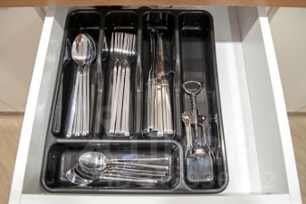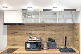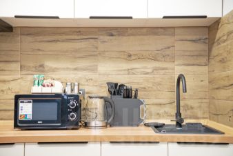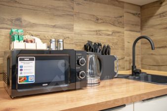 - В кухонной зоне: микроволновая печь, холодильник, посудомоечная машина, варочная панель, чайник, посуда и столовые приборы. Чай, кофе, сахар, соль, конфеты.