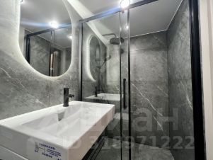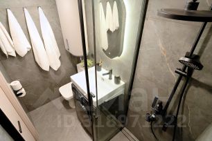 Чистый, в кафеле. Душевая кабина, туалет, раковина, зеркало, фен.
