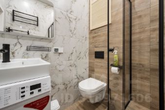 Чистый, в кафеле. Душевая кабина, туалет, раковина, зеркало с подсветкой, фен.
