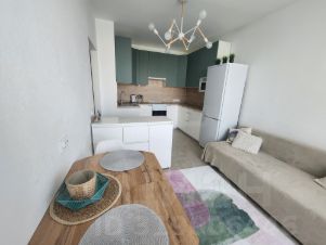 В квартире выполнен качественный ремонт, установлена новая мебель и техника. Покрытие пола - плитка с теплым полом, в комнатах - ламинат.