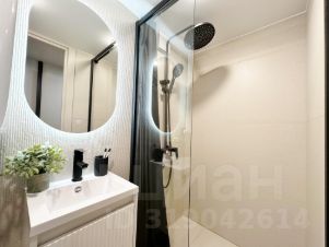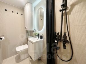 Чистый, в кафеле. Душевая кабина, туалет, раковина, зеркало, фен.