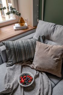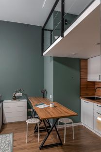 Кухонная зона оборудована всем необходимым для приготовления пищи. Вы найдете плиту, холодильник, микроволновую печь и посуду, чтобы с легкостью приготовить свои любимые блюда и насладиться домашней атмосферой.