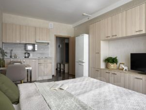 Современные апартаменты в ЖК Салют станут отличным выбором как для молодой семьи, так и для командированных гостей. Для комфортного отдыха предусмотрена удобная двуспальная кровать - трансформер, а полностью оборудованная кухня позволит приготовить Ваши любимые блюда. Искушенные путешественники по достоинству оценят удобное расположение комплекса с отличной транспортной развязкой, а также близость к аэропорту и Московскому шоссе.