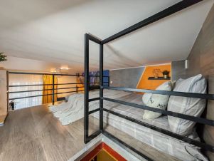 Студия двухуровневая, комфортно вмещает 1-3 гостей: наверху — кровать 140200 см, внизу — раскладной диван 160220 см.