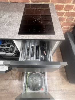 Квартира состоит из прихожей зоны с большим шкафом с зеркальными створками; просторной кухни-гостиной, укомплектованной кухонным гарнитуром, холодильником с небольшой морозильной камерой , встроенной техникой(варочная поверхность индукционная, ПММ), стиральной машиной, большой телевизор SmartTV. Есть фильтр питьевой воды.