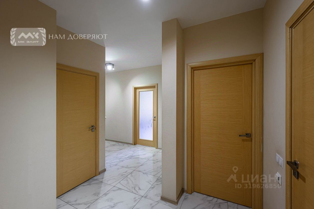 Планировка функциональная: большая прихожая, просторный коридор, изолированные комнаты площадью 19,2 м², 16,4 м² и 15,7 м². Два санузла, вместительная гардеробная. Квартира светлая и теплая, окна выходят на тихую, зелёную сторону комплекса, не на дорогу.