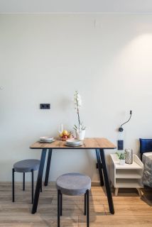 В доме есть ресепшен, который работает 24/7, поэтому возможно заселение поздно ночью. Заселение бесконтактное.