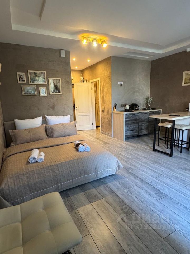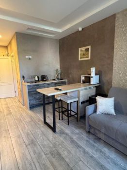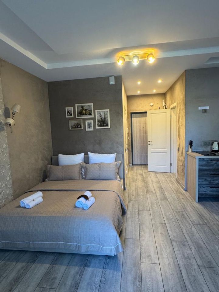 Апартаменты оснащены всем необходимым для комфортного проживания: современными кухонными приборами, удобной мебелью и просторной спальной зоной с ортопедическим матрасом и премиум бельем постельным
