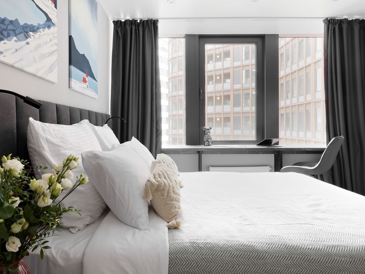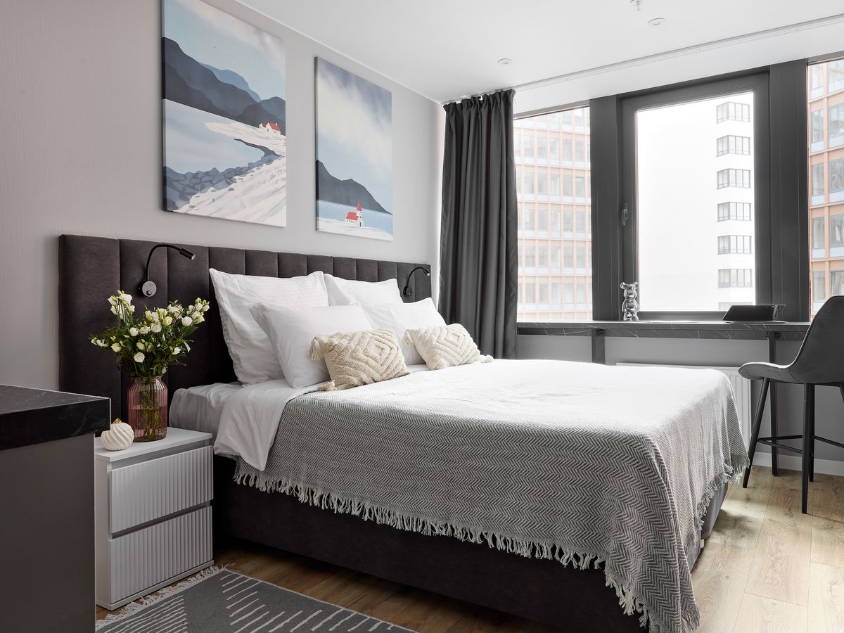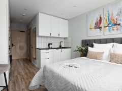 МЕБЕЛЬ: Кровать с ортопедическим матрасом 160х200, диван 65х180 в разложенном виде, вместительный шкаф для ваших вещей, совмещенная рабочая и обеденная зона с видом на панораму города, удобства для приготовления еды в номере. Каждому гостю выдается постельное бельё и полотенца. Шторы блэк-аут гарантируют вам крепкий и спокойный сон в период Белых ночей.