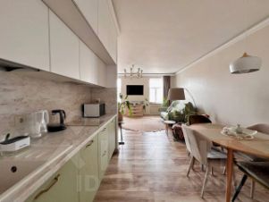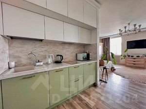 Кухня совмещена с гостиной и укомплектована бытовой техникой: индукционной плитой, СВЧ, чайником, посудомоечной машиной, холодильником, стиральной машиной.