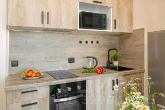 Кухонная зона со всем необходимым: варочная поверхность, духовка, чайник, микроволновка, посуда и кухонная утварь;