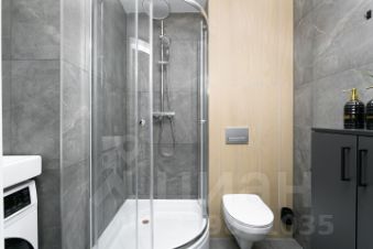 Ванная комната с душевой кабиной, стиральной машинкой и полотенцесушителем;
