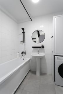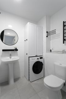 Квартира новая, выполнен евро-ремонт. Квартира оборудована кухней со встроенной техникой (варочная поверхность, духовой шкаф, посудомоечная машина, вытяжка), холодильником, стиральной машиной, а также всей необходимой мебелью.