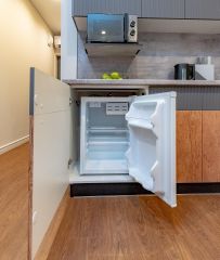 Кухня со всем необходимым (холодильник, плита, микроволновая печь, чайник, а так же посуда, приборы )