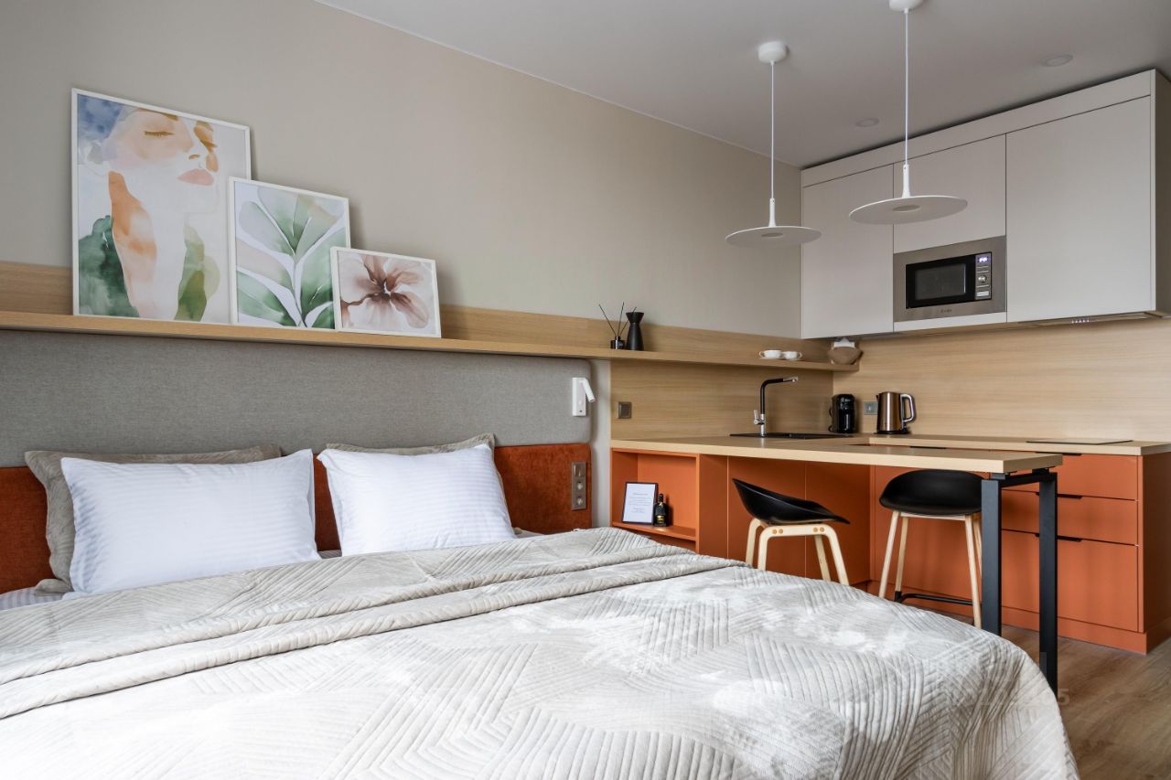 В апартаментах с комфортом могут разместиться до 2-х гостей. Оформление в современном стиле, студия оснащена всем необходимым-двуспальной кроватью, с удобным матрасом и идеальным бельём, мебелью и техникой-ТВ.