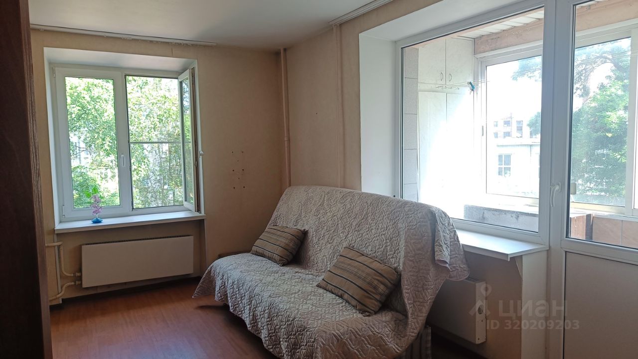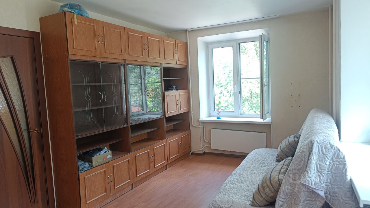 В комнате и на кухне есть вся необходимая мебель. В комнате раскладной диван( на ламелях), встроенный шкаф купе, корпусная мебель. Два окна обеспечат хорошее проветривание. Из комнаты выход на застекленный балкон, где так же есть два небольших шкафа. Солнце появляется во второй половине дня. Вид на зеленый двор.