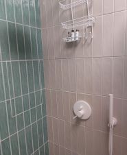 Санузел: душевая кабина, стильная раковина, объемный навесной шкаф для хранения, стильный умывальник, унитаз, змеевик с функцией регулировки и таймера.
