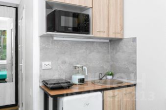 Кухонная зона со всем необходимым: варочная поверхность, чайник, микроволновка, холодильник, посуда и кухонная утварь;