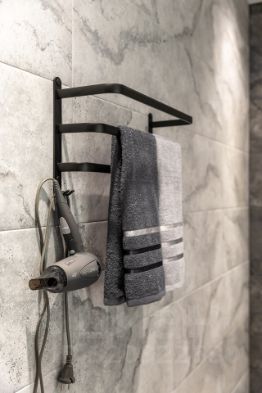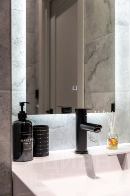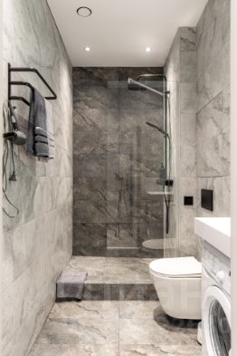 • Современная ванная комната: ванная с тропическим душем, фен, хлопковые пушистые полотенца, средства гигиены, тёплый пол