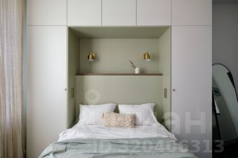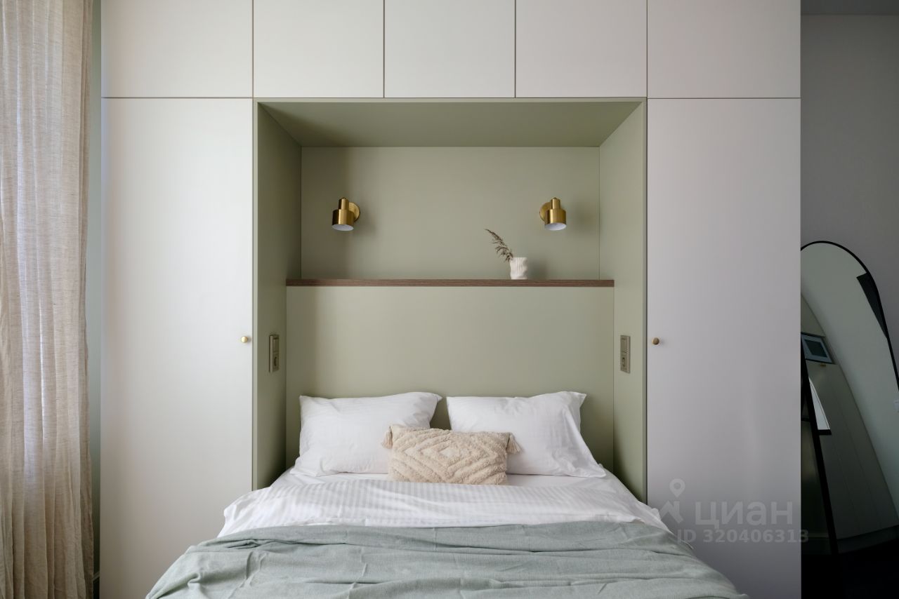 Кровать с подъемным механизмом, что создает дополнительное место для хранения.