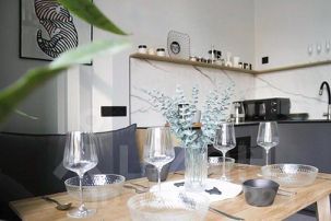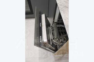 • Современная кухня с холодильником, посудомоечной машиной, СВЧ печью, плитой и набором посуды