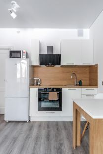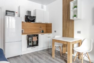 ~ кухня со всей необходимой посудой и встроенной техникой, включая индукционную плиту, микроволновку, электрический чайник