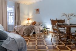 Вас ждет квартира с предметами дизайна, картинами, свежим ремонтом и новой мебелью и прекрасным видом из окон.