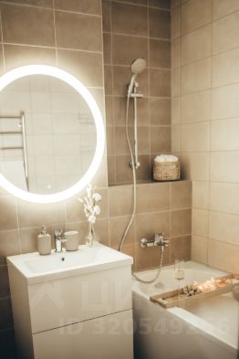 САНУЗЕЛ: чистый, в кафеле, ванна, гигиенический душ, зеркало с подсветкой, полотенцесушитель, раковина, фен.