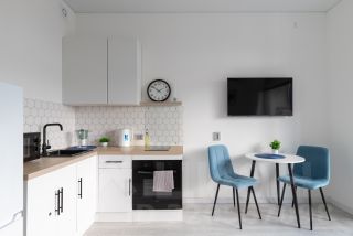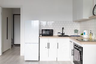 Хорошо укомплектованная кухня индукционная плита, чайник, микроволновая печь, холодильник, посуда и столовые приборы, обеденный стол и стулья с мягкими сиденьями.