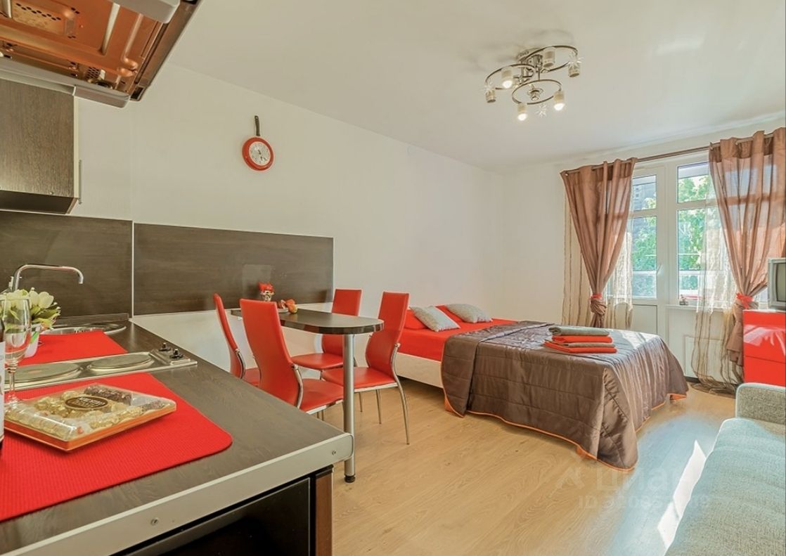оснащение : 2-х сп. кровать, диван, комод, ТВ, стол стулья, кухонная мебель, минихолодильник с морозильной камерой, СВЧ чайник, утюг, гладильная и сушильная доски