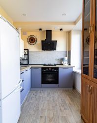 Просторная светлая кухня-столовая оснащена всем необходимым. Кухонная мебель с посудой и столовыми принадлежностями.