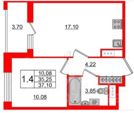 Общая площадь 37.10 кв м, комната 10, кухня - гостинная 17.10, caн/узел совмещенный, просторная лоджия 3.7.